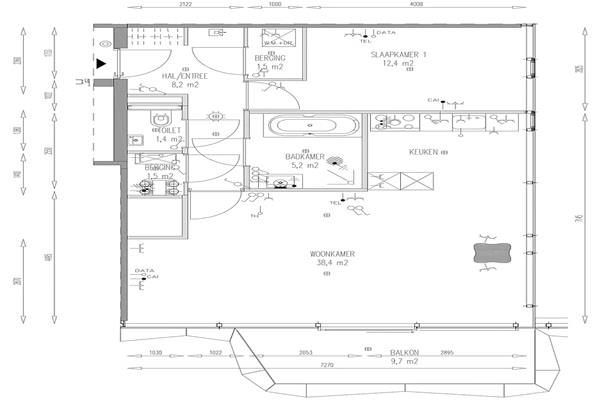 De licht overgoten woonkamer wordt gedomineerd door de grote raampartijen tot aan de grond. De woonkamer is ruim van opzet en praktisch in te delen. Een grote schuifpui geeft toegang tot het balkon.