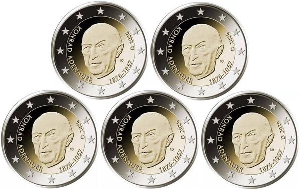 Duitsland 2 Euro 2026 'Konrad Adenauer'. Duitsland heeft een bijzondere 2 Euromunt uitgegeven met als thema: Konrad Adenauer. Konrad Adenauer was een Duitse politicus van de CDU en daarnaast Jurist. Hij was de eerste Bondskanselier van Duitsland en behield deze positie ruim 14 jaar! Hij zorgde voor wederopbouw, economische stabiliteit en integratie met het Westen. Hij bouwde een krachtige democratie op en geloofde in Europese samenwerking. Konrad Adenauer was voordat hij Bondskanselier werd burgemeester van Keulen, waar hij werd opgepakt door de nazi's en werd vastgezet. Om te herdenken dat Konrad Adenauer 150 jaar geleden werd geboren, in 1876 heeft Duitsland besloten om hier een bijzondere 2 Euromunt over uit te geven. Op de voorkant van deze speciale 2 Euro ziet men een afbeelding van Konrad Adenauer en wordt zijn naam weergegeven. Verder wordt het jaartal van uitgifte, 2025 weergegeven. De Duitse munten kennen 5 slagplaatsen, A = Berlijn, D = München, F = Stuttgart, G = Karlsruhe en J = Hamburg. Deze serie Duitsland 2 Euro 2026 'Konrad Adenauer' bevat alle 5 slagplaatsen en zijn allemaal verpakt in bedrukte munthouders. Bij Eurocoinhouse kunt u allerlei verschillende soorten euromunten kopen, maar ook accessoires, sets en bijzondere uitgaves van herdenkingsmunten.