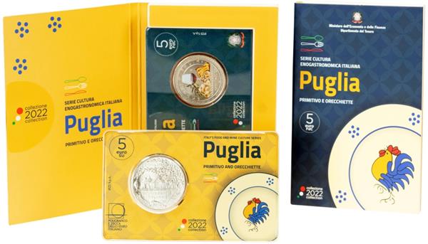 Italië 5 Euro 2022 'Puglia - Primitivo en Orecchiette'. Italië geeft een serie 5 Euromunten uit met als thema: Italiaans eten en wijn. Dit is de derde munt uit deze serie! Orecchiette (Italiaans voor oortjes) is een pasta dat voornamelijk wordt gegeten in de meest zuidelijke regio van Italië: Apulië. Apulië is de Nederlandse naam voor de Italiaanse regio: Puglia. Orecchiette wordt vaak gegeten met broccoli en gehaktballetjes. Primitivo is een heerlijke rode wijn dat gemaakt wordt van de Zinfandel druif. Deze heerlijke wijn wordt veel gemaakt in Puglia! Op de voorkant van de munt ziet men een afbeelding van de Orecchiette en Primitivo met op de achtergrond een olijftak en een heerlijk stukje brood uit Altamura. Ook ziet men de waardeaanduiding van 5 Euro en het jaartal van uitgifte, 2022. Op de achterkant van de munt ziet men een Trulli, een karakteristieke huis dat zich in het hart van Puglia bevindt! Verder ziet men een olijfboom en een dolfijn. De munt is verpakt in een schitterende Coincard die vervolgens weer verpakt is in een schitterende blister! Bij Eurocoinhouse kunt u allerlei verschillende soorten euromunten kopen, maar ook accessoires, sets en bijzondere uitgaves van herdenkingsmunten.